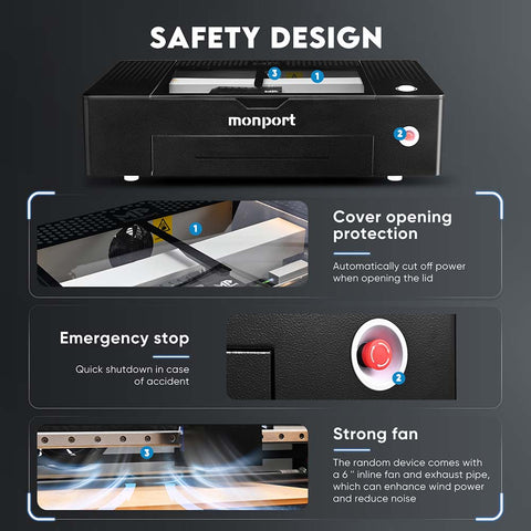 Safety is a top priority with the Monport ONYX 55W. The machine is equipped with multiple safety features to ensure a secure working environment. The automatic laser power adjustment prevents accidents due to excessive power, while the emergency stop button allows for immediate cessation of operations in case of any unforeseen situations. The ONYX 55W also features a closed-loop water circulation system that maintains optimal laser tube temperature, extending its lifespan and providing peace of mind during prolonged use.