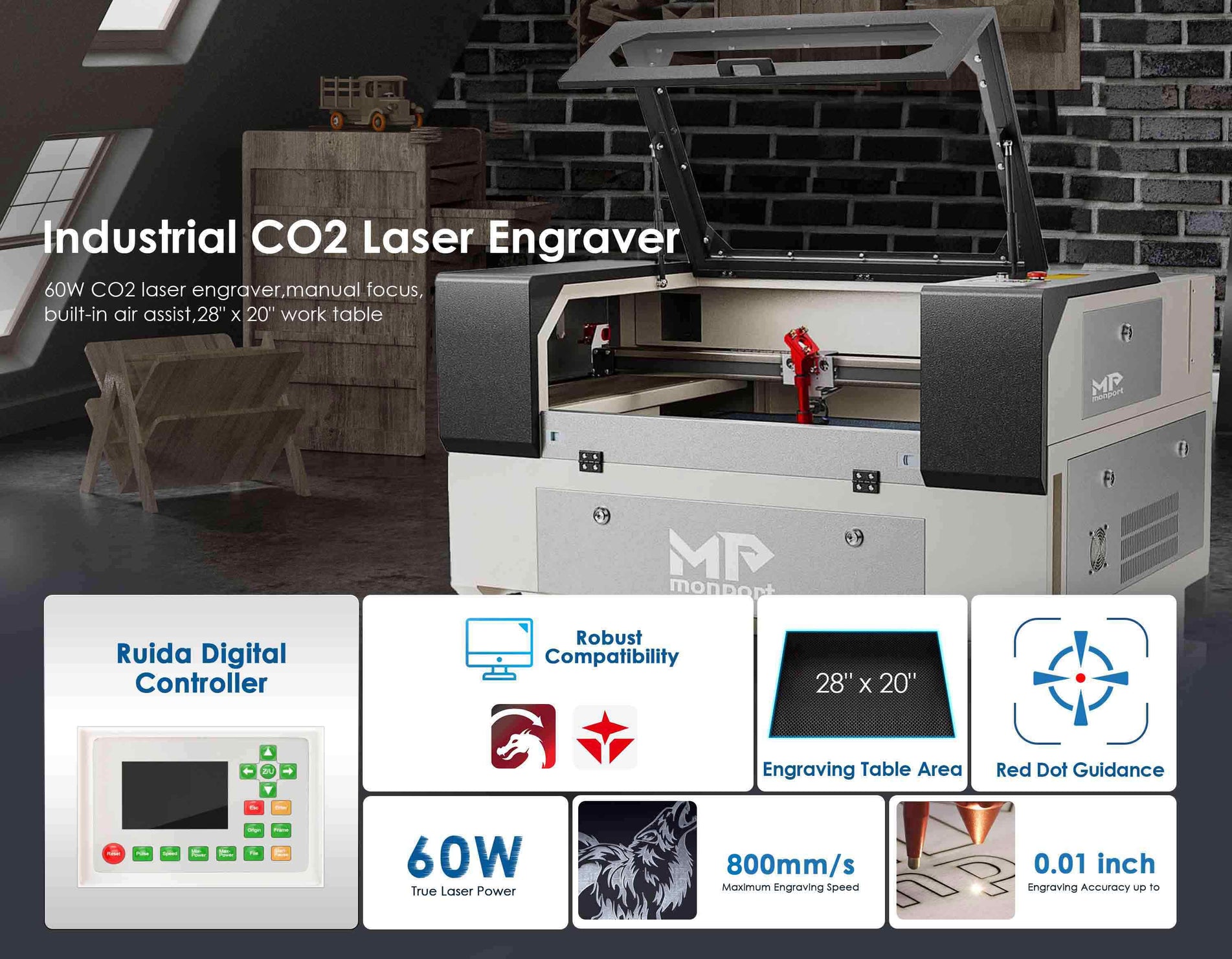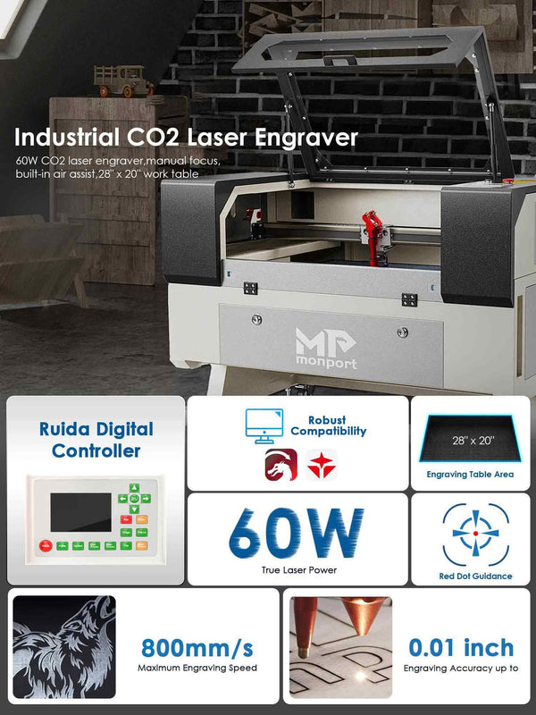 Monport 60W CO2 Laser Engraver & Cutter (28" x 20") with Autofocus