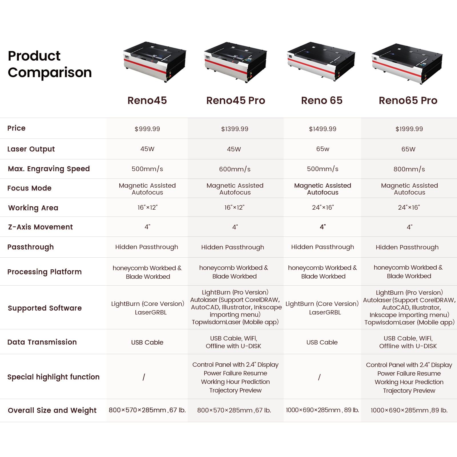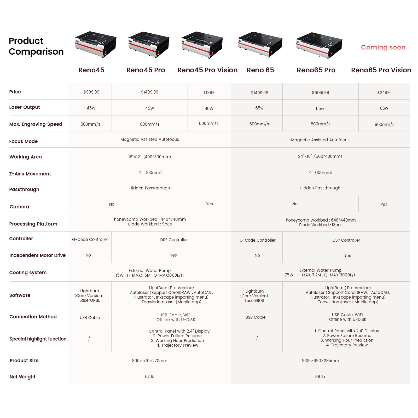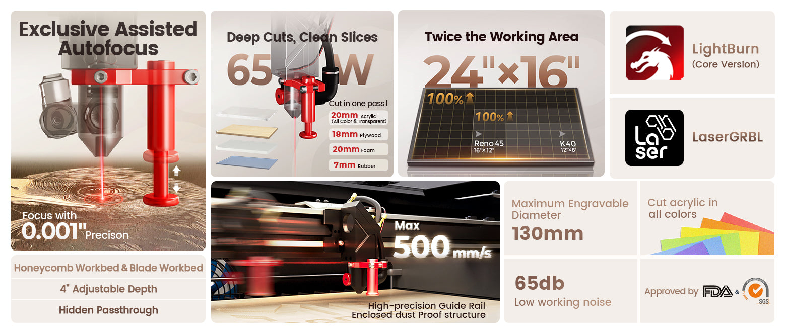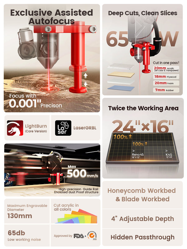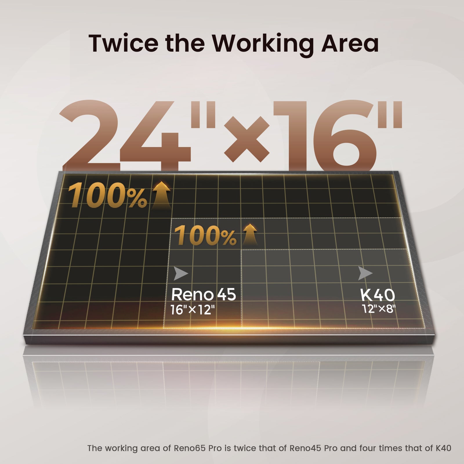 Compared to the Reno45, the Reno65 has a more powerful 65W laser power while still maintaining a compact body size(600 * 400mm working area,2 times Reno45, 4 times K40).Of course, with the support of high-quality reflective and focusing lenses, Reno65's cutting ability is further enhanced, and it can easily cut through 20mm acrylic at once.