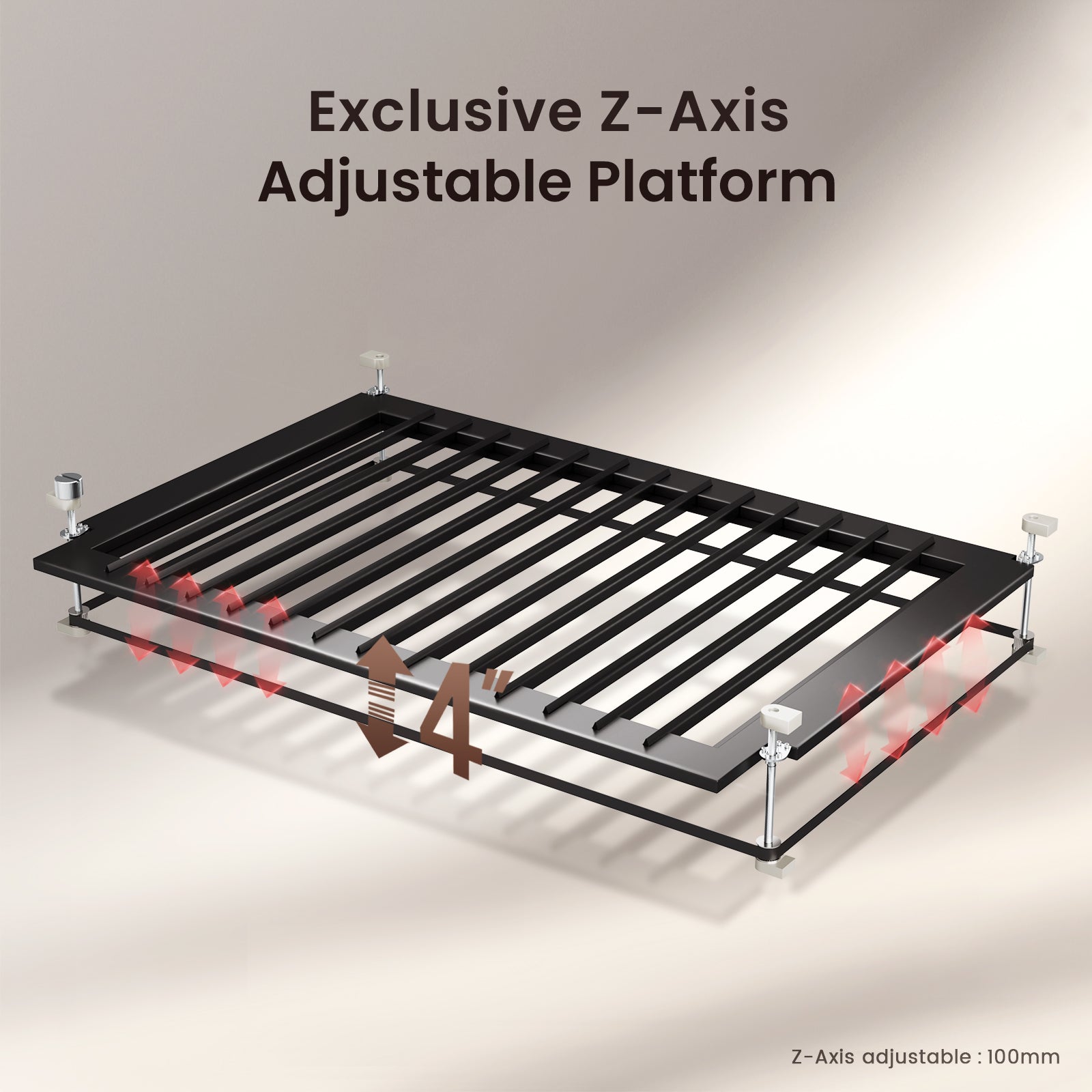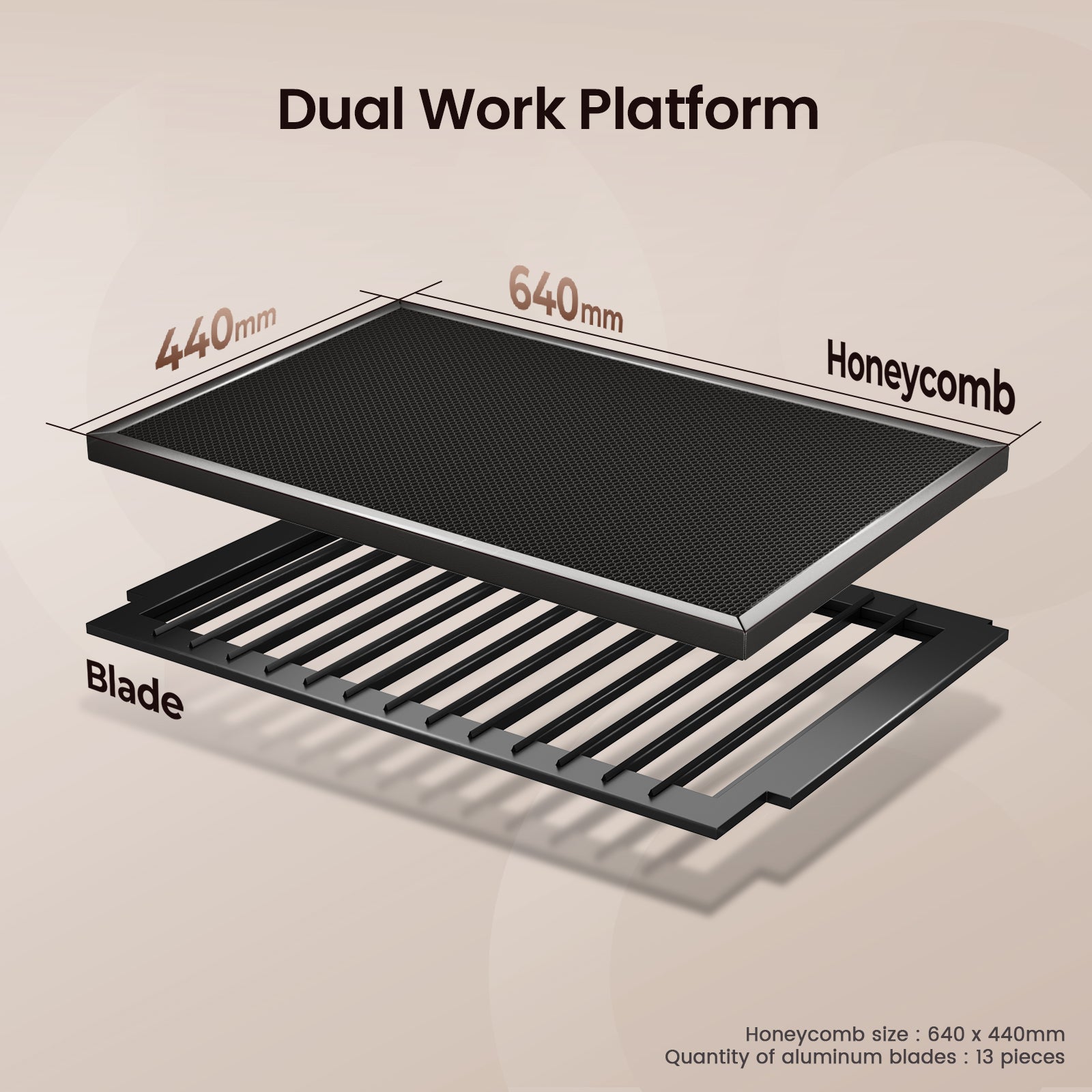 Considering the processing limitations of desktop products on the market, Monport has achieved a working area of 600 * 400mm (2 times Reno45, 4 times K40) while maintaining a small body size. At the same time, the Z-axis has a maximum adjustment range of 100mm (none of the existing desktop products on the market have this feature), and additional dual working platforms are provided: blade flat platform and honeycomb; Finally, there is a hidden front passthrough design. All of this is to give Reno stronger processing space.