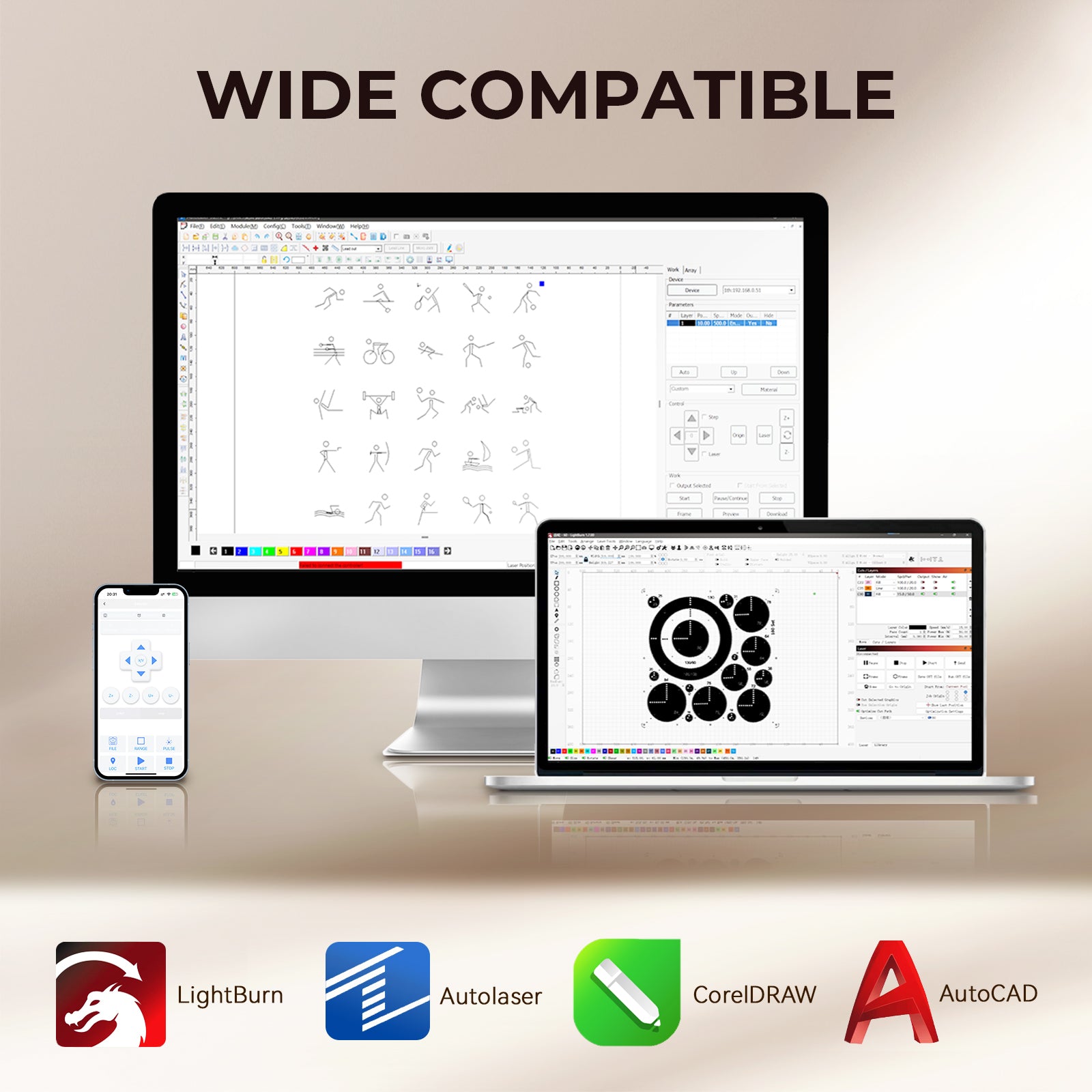 For the first time, Monport has applied a control panel with LCD display to the desktop laser, coupled with the more user-friendly and feature rich carving software Autolaser, allowing you to quickly get started even if you have never used a carving machine before. Of course, the Reno65 Pro is compatible with LightBurn, and you can choose the operating software according to your own usage habits.The most important point is that you can also connect to Reno65 Pro through a mobile app to complete carving operations.