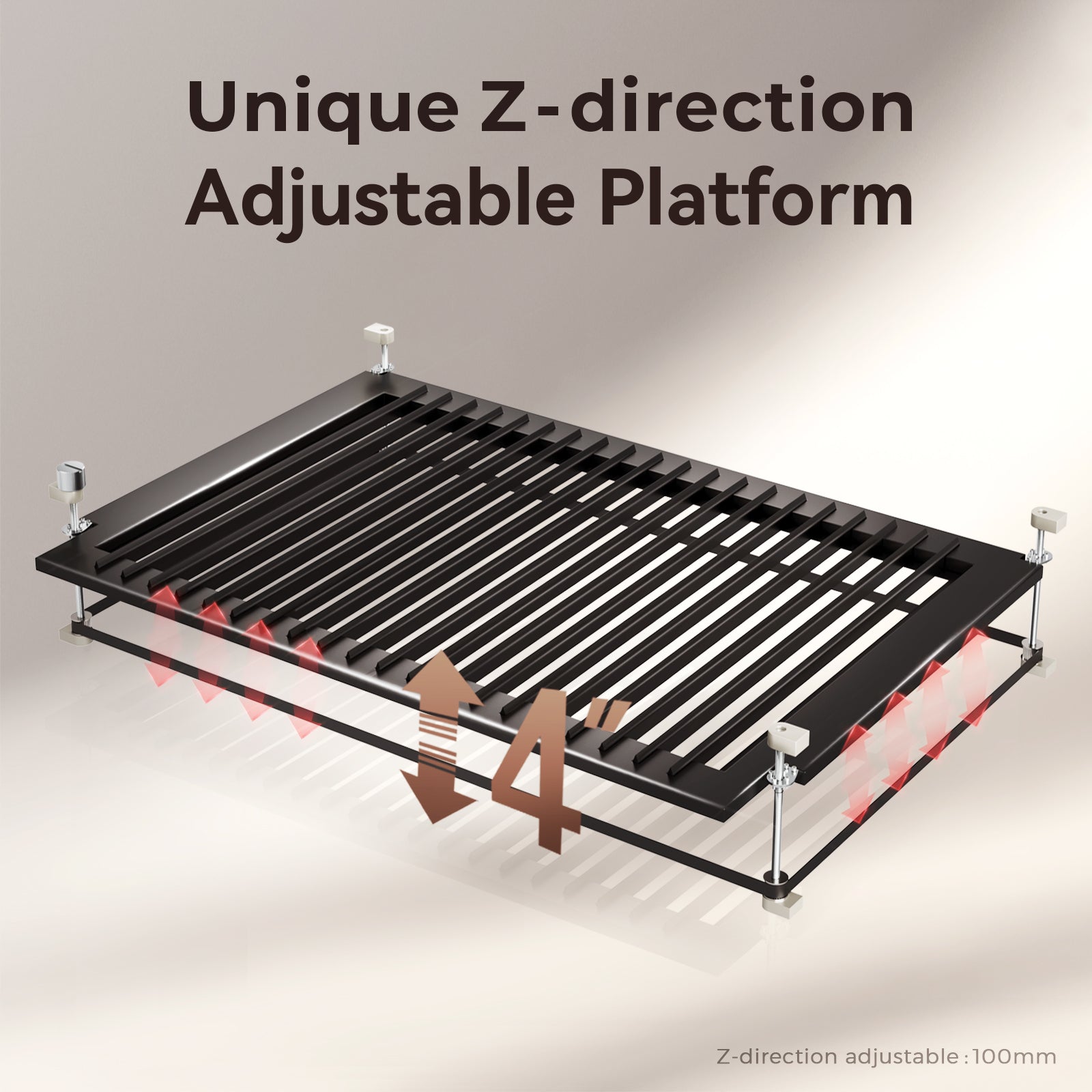 Considering the processing limitations of desktop products on the market, Monport has achieved a working area of 600 * 400mm (2 times Reno45, 4 times K40) while maintaining a small body size. At the same time, the Z-axis has a maximum adjustment range of 100mm(none of the existing desktop products on the market have this feature), and additional dual working platforms are provided: blade flat platform and honeycomb; Finally, there is a hidden front passthrough design. All of this is to give Reno stronger processing space.