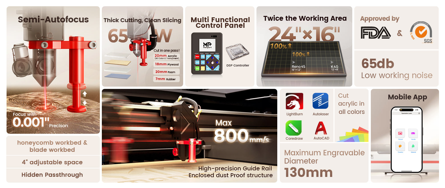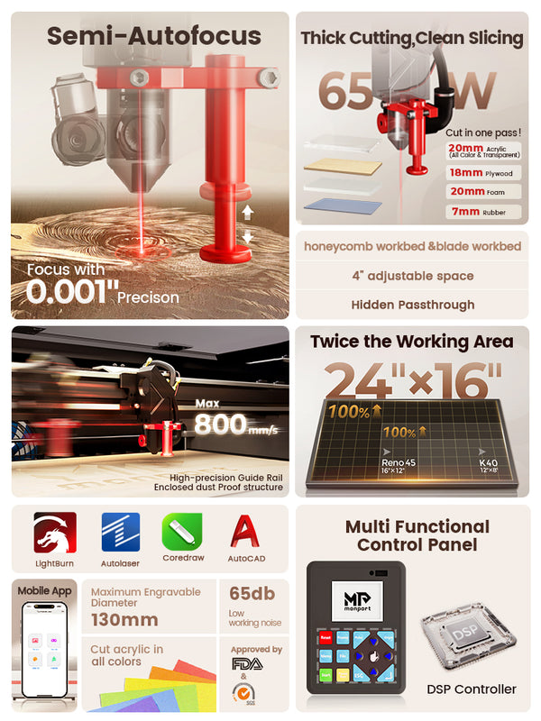 Monport Reno65 Pro 65W Desktop CO2 Laser Engraver & Cutter (24" X 16") with DSP Controller and Semi-Autofocus