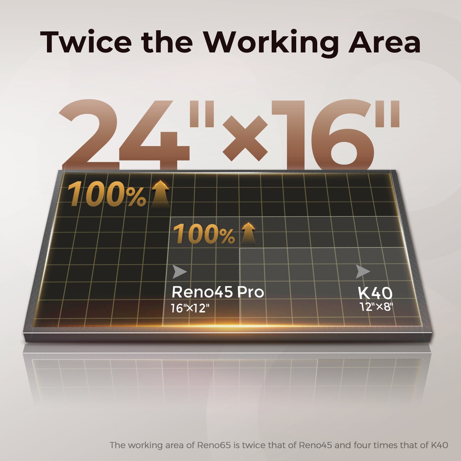 Compared to the Reno65 Pro, the Reno65 Pro has a more powerful 65W laser power while still maintaining a compact body size(600 * 400mm working area,2 times Reno45 Pro, 4 times K40).Of course, with the support of high-quality reflective and focusing lenses, Reno65 Pro's cutting ability is further enhanced, and it can easily cut through 20mm acrylic at once.